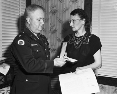 Mrs. Velma Tatum of 516 Bedell accepts a Bronze Star awarded posthumously to her son, Corp. James A. Prater, killed in Korea, from Major Leo Byrne of the Organized Reserve Corps.