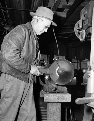 The Ed G. Edgin brass factory, 2717 W. 6th, is at work again, thanks to Red Cross aid. Edgin is running one of the motor disk grinders repaired by the Red Cross after the May 17 flood. Published in Fort Worth Star-Telegram evening edition March 11, 1950.