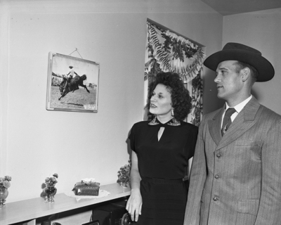 Johny E. Spruell, Bible student and rodeo performer, is shown with his wife looking at a picture made of his performance in the 1946 rodeo at Phoenix.