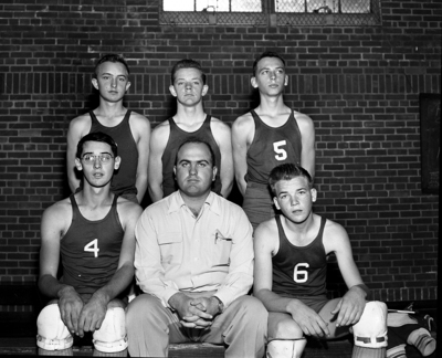 Group B junior high school basket ball champions for second straight year are Rosemont's Broncos. Left to right, David Wright, Coach Earl Conrad, Kenneth Dean; rear, Don O'Neal, Paul Gauntt, and Arthur Travis. Published in Fort Worth Star-Telegram evening edition, February 21, 1952.