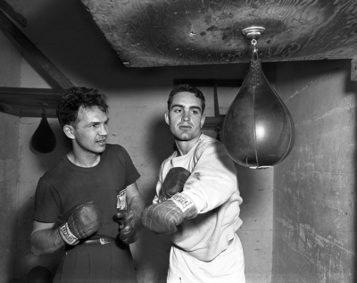 Billy Frick (right), novice middleweight, warms up on light bag as Coach Frank Karr gives advice. Published in Fort Worth Star-Telegram evening edition January 10, 1952.