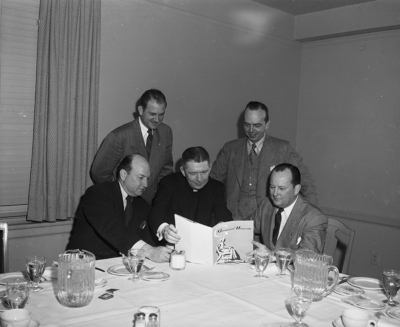 Reverend L. R. McHugh, director of admissions and assistant dean of Georgetown University, Washington, reviews the school's new brochure with a group of Fort Worth alumni who honored him with a luncheon. They are, seated, Frank Crumley, left, and Doyle Willis, and, standing, B. Herbert Manning, left, and Robert F. Snakard.