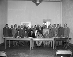 Shown are the Stock Show officials. Some of the officials are sitting in front of a table while the rest stand in the back as they pose for the camera.