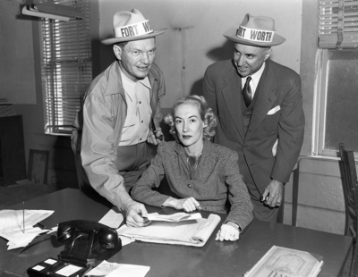 Fort Worth Kiwanians dipped into Central Texas to extend blanket invitations to the Southwestern Exposition and Fat Stock Show. At the right, Faye Foster of the Brownwood Bulletin gets all the facts from Dan Hudson, left, and Lorin Boswell of Fort Worth. Published in Fort Worth Star-Telegram morning edition January 11, 1952.
