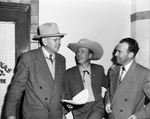 Promoting the show at Brownwood was Homer Baughman Jr., center in picture, president of the Fort Worth West Side Kiwanians, with Brownwood Mayor A. N. Thomason, left, and Lindsey Bublin Jr., Brownwood Kiwanis president. Published in Fort Worth Star-Telegram morning edition January 11, 1952.
