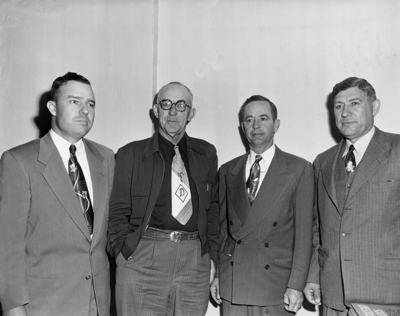 R. P. Marshall of Marlin, left, is assistant to A. L. Darnell, second from left, dairy cattle superintendent. A. B. Childrens, right, of Mart is assistant to Rufus Peeples of Tehuacana, second from right, head of the college livestock judging contests. Published in Fort Worth Star-Telegram morning edition January 20, 1952.