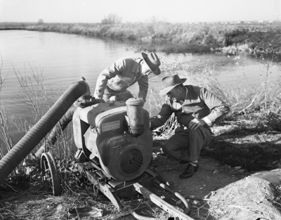 Jones County Agent Bill Lehmberg, left, and Russell Fagan look at the 750-gallon-per-minute pump that Fagon uses to irrigate his lush grass plots.