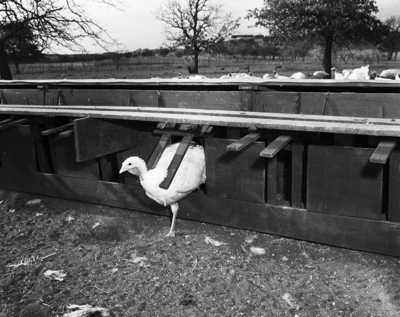 This trap nest permits only one hen in a nest at a time. The entry is automatically barred until a hen leaves, unlatching the entry.