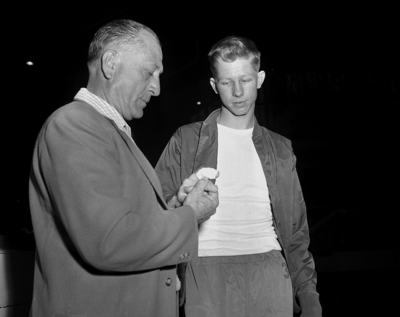Image shows Coach Harry Hamilton of Thomas Jefferson (San Antonio) inspecting a cut finger of Nelson Alexander, who scored 176 points in City Conference Play.