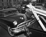 Police Officer A. W. Kohles is shown scratching another car license number from his list of automobiles wanted for accumulated parking tickets. The car was picked up in the 500 block of E. 5th. To reclaim his car, the motorist must pay: fines for his delinquent parking tickets, a towage fee of $7.50, with.50 cents a day storage and a $5 warrant charge.