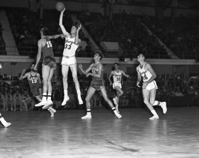 Here's Frogs' George McLeod getting off that two-pointer from beyond the free-throw circle in first period of Texas Christian University's 75-57 victory over Baylor. Bears are Norman Mullins (13). John Starkey (15) and Ralph Johnson (11) while other Frogs are J. Bryan Kilpatrick (30) and Ted Reynolds (26). This goal put Christians ahead for good at 11-9 as they scored 14th triumph. Published in Fort Worth Star-Telegram morning edition, January 12, 1952.