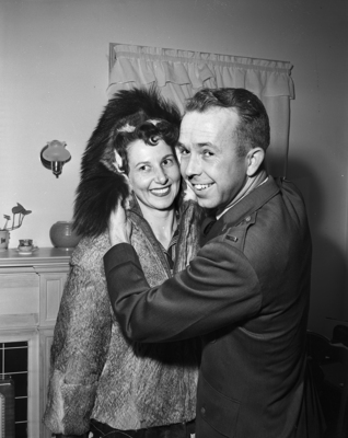 First Lieutenant John A. Lee, and his wife, Mrs. Lee, recently returned from Alaska, show off a native Alaskan fur coat that Mrs. Lee wore during Arctic winters. They are visiting his parents, Mr. and Mrs. J. B. Lee of 4846 White Settlement Road.