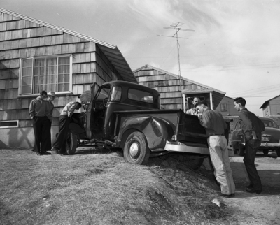 This driverless pickup truck smashed into the home of Mrs. W. G. Brouse, 2305 Mcgown, after making a three block pilgrimage up and down hill. Frank Palmer, 71, of 2315 N. W. 25th was tumbled from the vehicle in a collision at Ephraim and N. W. 25th.