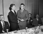 Clark Nealon, left, sports editor of Houston Post, presents Ray McKown, Texas Christian University tailback, Post's award as most valuable back in Southwest Conference in 1951. Published in Fort Worth Star-Telegram morning edition January 15, 1952.