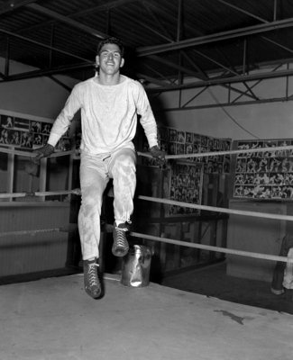 Shown is Wesley McDonald from Diamond Hill. He seeks to win the heavyweight gloves title. He is shown posing on ring ropes. Published in Fort Worth Star-Telegram evening edition January 15, 1952.
