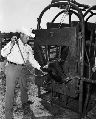 Image from a series on Dr. Raymond Hander, a veterinarian. Iage shows Dr. Hander injecting iodine into the blood stream of a young Milking Shorthorn bull owned by Vance McCullough of Quanah. Published in the June edition of the Fort Worth Star-Telegram's Ranch and Farm News, 1951.