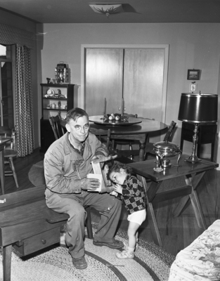 Little George Liggitt, 2, likes to help granddad. He is shown probing the underside of a stool with a screw driver while W. C. Hollins tends his sanding operation.