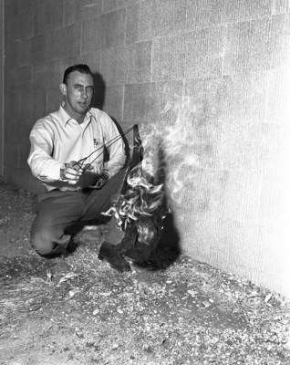 Image here shows Thomas Jean watching one of his favorite Christmas presents go up in smoke. He is glad that the sweater burned on the hanger and not on his back.
