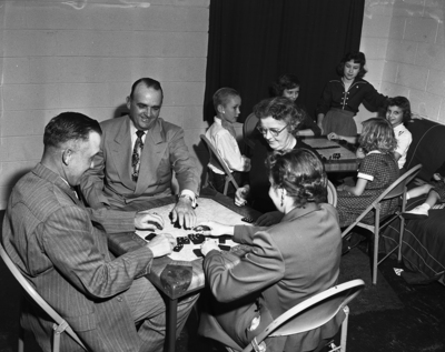 At the Avondale Community Club house, Hardy Tadlock, Carl W. Slay, Mrs. Slay and Mrs. Tadlock, reading clockwise, engage in a game of dominoes while some Avondale children have a game going in the background. The club sponsors a monthly dinner meeting.