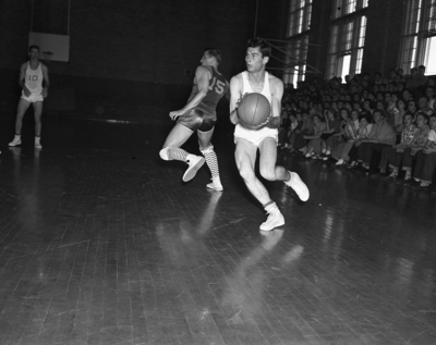 Poly's Bill Enis cuts for basket against Arlington Heights. Parrots won, 59-42, took 4A-3 lead. Published in Fort Worth Star-Telegram evening edition, January 24, 1952.