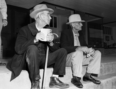 E. L. Long, left, and J. J. Jones greet Fort Worth Civitans who made an unscheduled stop at Sanger on a Southwestern Exposition and Fat Stock Show advertising swing through North Texas. Published in Fort Worth Star-Telegram morning edition January 17, 1952.