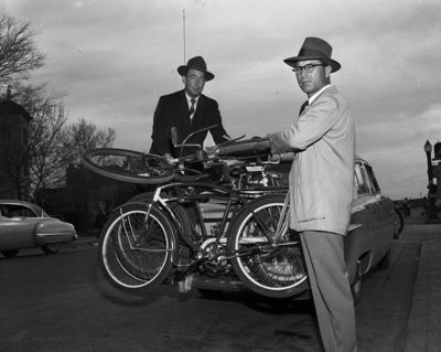 Bicycle theft division officers, T. A. Bates, left, and E. E. Garrett, right, unload at City Hall unlicensed bicycles. The officers were impounding bicycles without current licenses.
