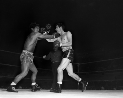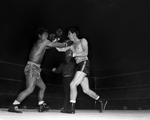 Joe Marlow of Carswell Air Force Base lands right on Steve Coronado's nose in open middleweight fight first round of Regional Golden Gloves. Marlow got decision in one of night's top fights. Published in Fort Worth Star-Telegram morning edition January 19, 1952.