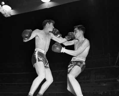 James Potts, left, Tech featherweight, hooks a left to the head and starts his right against Richard Walker, North Side. Walker stood up under this, won the decision. Published in Fort Worth Star-Telegram morning edition January 19, 1952.