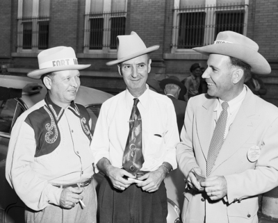 Shown are (left to right); Charlie Latham from Fort Worth, John Keller of Terrell, and Don Hilling of Fort Worth. They are part of the Stock Show goodwill tour of 1952.