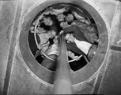 Members of the Arlington Volunteer Fire Department include, left to right, beginning with Johnny Clapper grasping fire station pole, Dinzel Huff, C. C. Barnes, Reverend Charles Dickey, Tom Bennett, Jack Cherry and Joe Houston. In 17 months Arlington rejuvenated it's volunteer fire department manned by shoe clerks, pharmacists, preachers, and editors. Arlington was in such a risk that fire insurance rates carried a 10 per cent penalty so the Lions Club rose to the challenge and the result was a revamping of the volunteer fire department. Published in Fort Worth Star-Telegram morning edition, March 19, 1950.