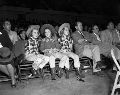 These 9-year-olds got their kicks at Golden Gloves. They're twins, Jan, left, and Anne Day, and Judy Turner. Published in Fort Worth Star-Telegram morning edition January 20, 1952.