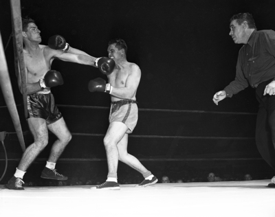 Wesley McDonald, 200-pound Diamond Hill heavyweight, gets there first with a long left on Grady Smith's chin in their thrilling bout. The 218-pound Smith was a TKO victim in the second round. Published in Fort Worth Star-Telegram morning edition January 20, 1952.