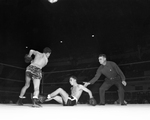 Referee Oliver Ball seems to be lending support to Monte Mitchell after Carter Riverside bantam is floored by Poly's Jack Brock in first round of their high school bout Golden Gloves card at Will Rogers Memorial Coliseum. Brock scored another knockdown in third round, got decision to avenge a 1951 loss to Mitchell in flyweight class. Published in Fort Worth Star-Telegram morning edition January 19, 1952.