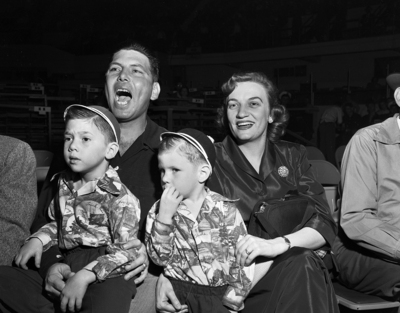 Marvin Harris family (he's Handley grid coach), backs Bobby Leach during lightweight bout. Boys are Teddy, 5, at left and Danny, 3. Leach won, too. Published in Fort Worth Star-Telegram morning edition January 20, 1952.