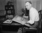 Series on men and their hobbies. H. O. Anderson adds a few strokes to his water color, "Checkerboard Valley." H. O. Anderson is long-time friends and neighbors on Frederick Street, with J. C. Owens and Mertz K. Williamson.