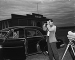 Series on simulated disaster problems by amateur radio operators. E. J. Holtke, at scene of "disaster," searches the sky for airborne unit.