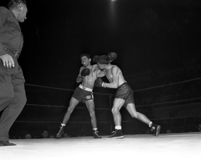Billy Tucker, left, of Poly winces although both he and Bobby Means of Diamond Hill miss their targets in third round of thrilling high school class welterweight championship bout. Tucker won decision. Published in Fort Worth Star-Telegram morning edition January 22, 1952.