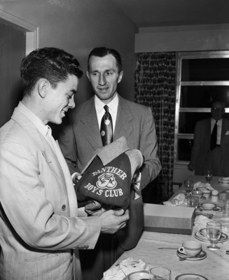 J. C. Crowley, regional Golden Gloves lightweight champion, gets Panther Boys' Club jacket from Ira DeShazo, executive secretary of the organization. Published in Fort Worth Star-Telegram evening edition January 25, 1952.