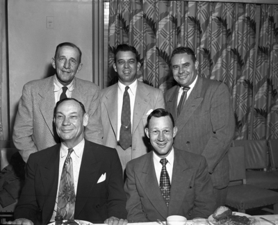 Five Golden Gloves officials are shown. They are, left to right, front, Sully Montgomery and J. D. Kitchens; Back, left to right, Rosco Minton, Bobby Bragan and Jimmy Neace. Published in Fort Worth Star-Telegram evening edition January 21, 1952.