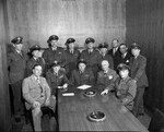 Military site selection board here to look over Greater Fort Worth International Airport as a possible location for a large permanent Air Force Reserve training center. Officers include: Colonel H. C. Thorne and R. E. Elwell, Major General Harry A. Johnson, and Colonel Lloyd E. Arnold and Robert Welchel, Captain M. J. Spair, Colonel R. W. Fellows, Lieutenant Colonel R. A. Porter, Colonel O. H. Lane and Lieutenant Colonel H. Huntington.