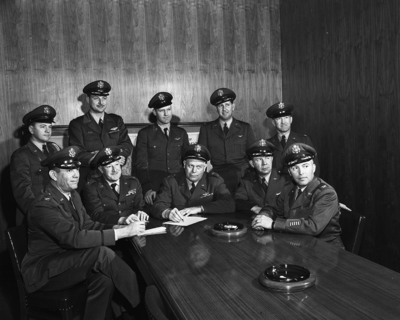 Greater Fort Worth International Airport, site selection board. Left to right, seated, Colonels H. C. Thorne and R. E. Elwell, Major General Harry A. Johnson and Colonels Lloyd E. Arnold and Robert Whelchel. Standing, left to right, Captain M. J. Spaur, Colonel R. W. Fellows, Lieutenant Colonel R. A. Porter, Colonel O. H. Lane and Lieutenant Colonel H. Huntington.