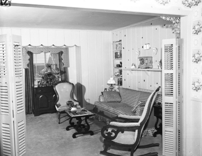 Interior shot of the Julius E. Corbin home at 2559 Highview Terrace. Shown is victorian and colonial furniture successfully blended pink velvet fabric used in upholstering of chairs.
