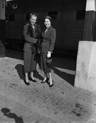 Mrs. H. H. Haberly, left, of New Canaan, Connecticut, international vice president of Alpha Phi, on an official visit to active and alumnae chapters in Texas, was greeted on her arrival by Mrs. Bennett Smith, 2529 Stadium Drive, a member of the sorority's board and a past district governor. Mrs. Haberly was guest of local Alpha Phi at the home of Mrs. Roy Fisher, 2316 5th Avenue.