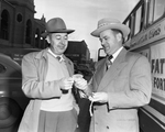 Five Fort Worth Lions Club visited 10 West Texas towns to drum up enthusiasm for the stock show. Franscis Quinn, left, manager of the Mineral Wells Chamber of Commerce, chats with Dennis for the Riverside Club. Published in Fort Worth Star-Telegram morning edition January 23, 1952.
