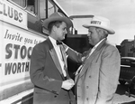Mayor Price Crawley of Ranger welcomes J. A. Grogan, Handley Lion. The mayor grabs Mr. Grogan's shoulder as he greets him. Published in Fort Worth Star-Telegram morning edition January 23, 1952.