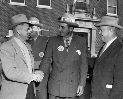 Mayor Marvin Naylor of Breckenridge, left, and Jimmy Farrell, right, get the word from C. C. (Corky) Makarwich of the River Oaks Lions Club. Published in Fort Worth Star-Telegram morning edition January 23, 1952