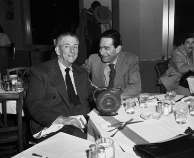 Edward Everett Horton struck one of his famous poses for the photographer, soon after he arrived for "The Merry Widow" rehearsals. At right is Ralph Herbert, who was "Prince Danilo," the romantic lead. The Fort Worth Civic Opera Association present The Merry Widow, world famous musicomedy on January 30 through February 3.