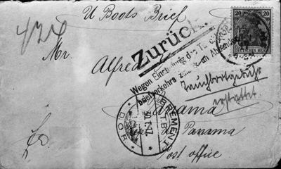 The cover, owned by Dr. L. A. Bernhardi, was started on its way across the Atlantic en-route to Panama but the submarine carrying it was recalled when the United States broke off relations with Germany in 1917. "U-Boat Brief" was written by the sender to insure transfer from regular mail service to the submarine service headquarters at Bremen.