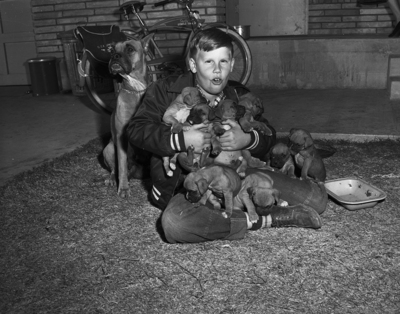 The eight boxer pups belong to Charles Scott Iobe, 9, son of Mr. and Mrs. Paul Iobe, 3611 Encanto, and grandson of Mr. and Mrs. Charles H. Kahn, 2921 Benbrook Blvd. The dame is Gretchen V. Burgfeld's and the sire is Dorlan's Buckeroo, owned by Bud Burmeister.