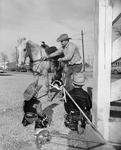 Two little gatecrashers forget their stick horses as they watch veteran rodeo Performer Hub Whiteman saddle up for the 1952 Southwestern Exposition and Fat Stock Show. Whiteman of Clarksville will compete in the bulldogging. The little cowboys are Richard, 3, and David, 6, sons of Mrs. and Mrs. Jack P. Smith Jr.. Published in Fort Worth Star-Telegram morning edition January 25, 1952